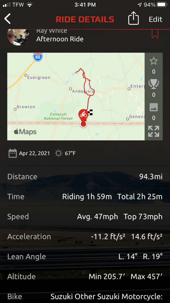 So the ride up there was awesome. As always I take the back country roads wherever possible, my favorite places to ride. Mostly what you have to look out for is animals, tractors, pot holes, sand on the road and other such minor things. As you can see from the “My Ride” app below, was a 94.3 mile round trip so not really far from home. Notice I can usually find a different route to return home, no sense in retracing your steps if you don’t have too.